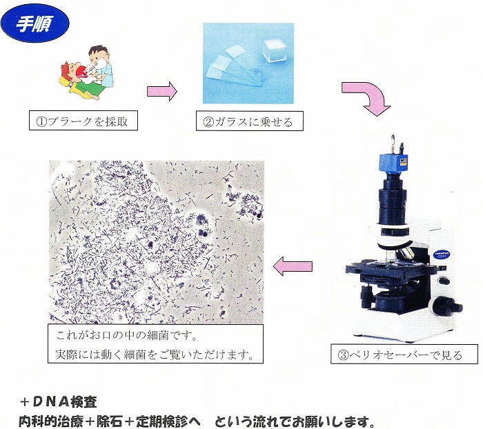 「ぺリオセーバー」という特殊な顕微鏡を使うことによって動く細菌を見て頂くことが出来ます。